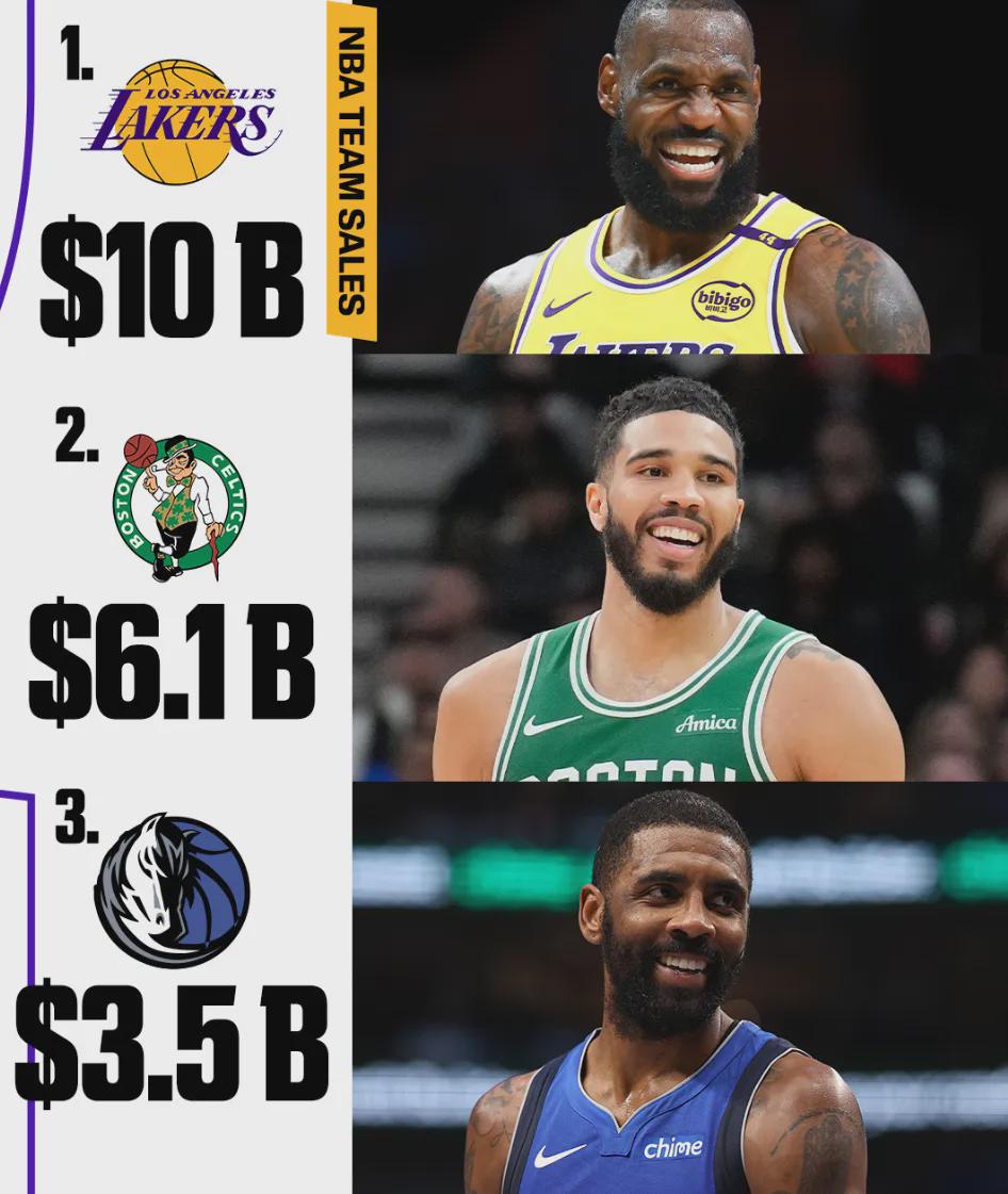 近些年,NBA的球队买卖并不罕见,但重磅的球队交易有三次,一次是2023年库班以35亿美元的价格出售小牛大部分股权,二次是2024年格罗斯贝克以61亿美元出手凯尔特人,三次就是2025年巴斯家族以100亿美元出售湖人大部分股权。