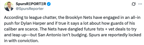 为此篮网也是尝试向马刺交易榜眼签,具体报道为:“篮网不惜抛出未来多个首轮签+老将合同试图向上交易选秀权,但马刺丝毫不为所动。据报道,马刺管理层正以坚定态度抓住榜眼签。”